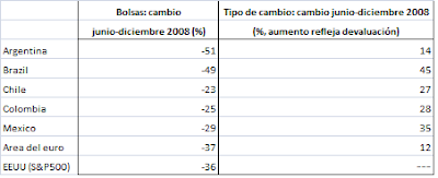 En cuanto a los mercados financieros, las cotizaciones de las bolsas de valores han mostrado una fuerte caída, que ha excedido la de las bolsas en los países avanzados, aunque no ha sido necesariamente mayor que la observada en otras economías emergentes. Como ejemplo, desde mediados de 2008, el índice Bovespa en Brasil cayó en un 46%, y en México, la otra bolsa de importancia en la región, los valores cayeron un 40%. Inicialmente se pensaba que por las características de los mercados financieros latinoamericanos no había una alta presencia de activos financieros “tóxicos”. Sin embargo, en Brasil y México una serie de empresas invirtieron en instrumentos derivados, particularmente referidos al riesgo cambiario. La subsiguiente turbulencia llevó a que estas empresas sufrieran importantes pérdidas y generó fuertes presiones sobre el mercado cambiario.